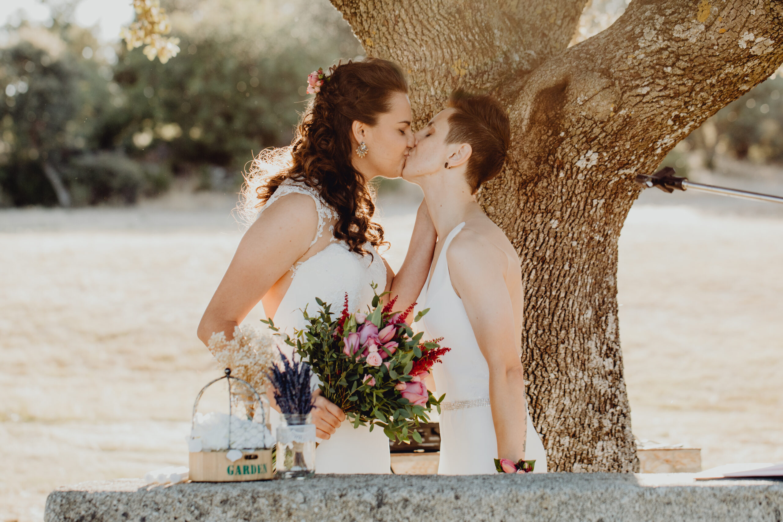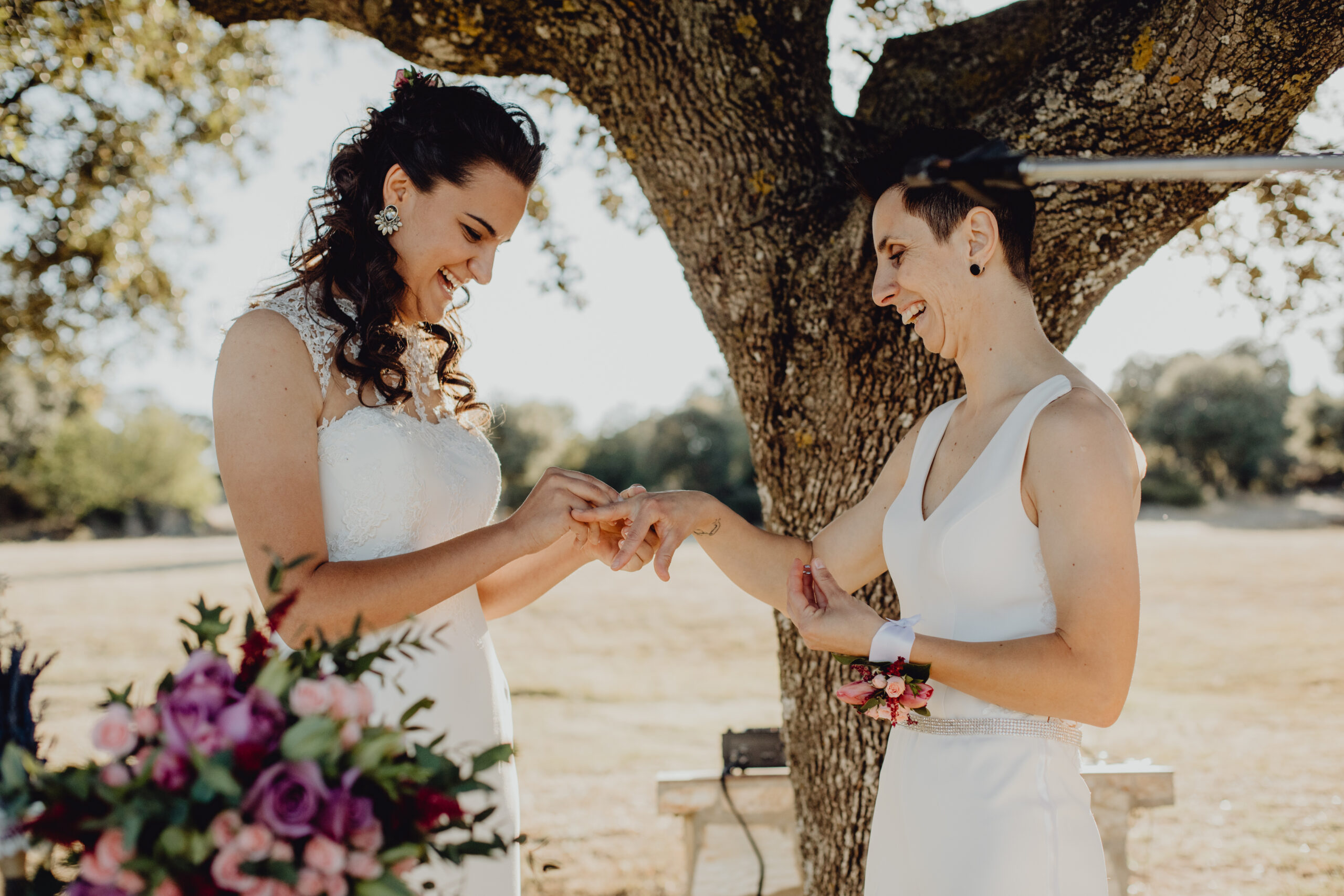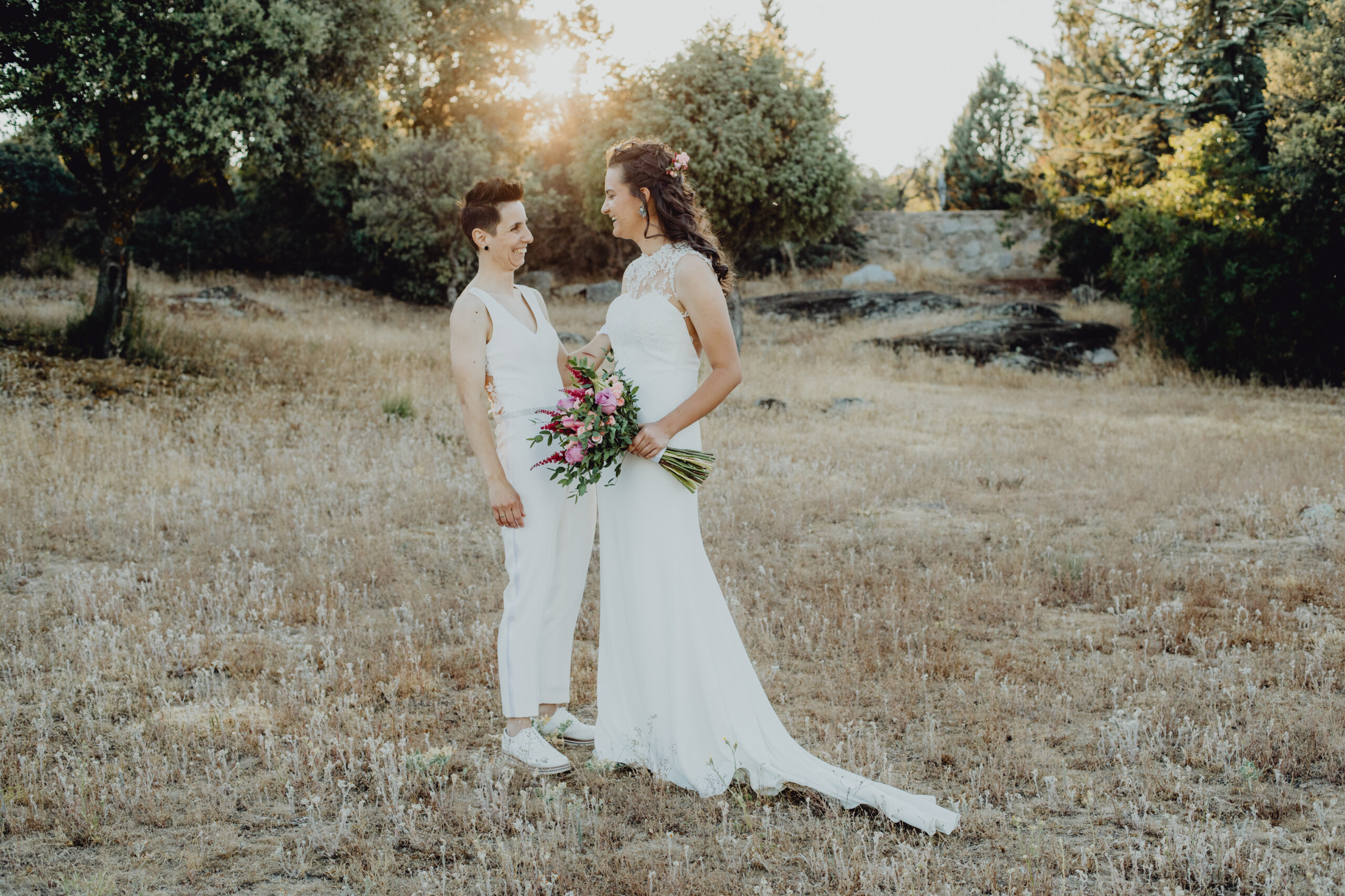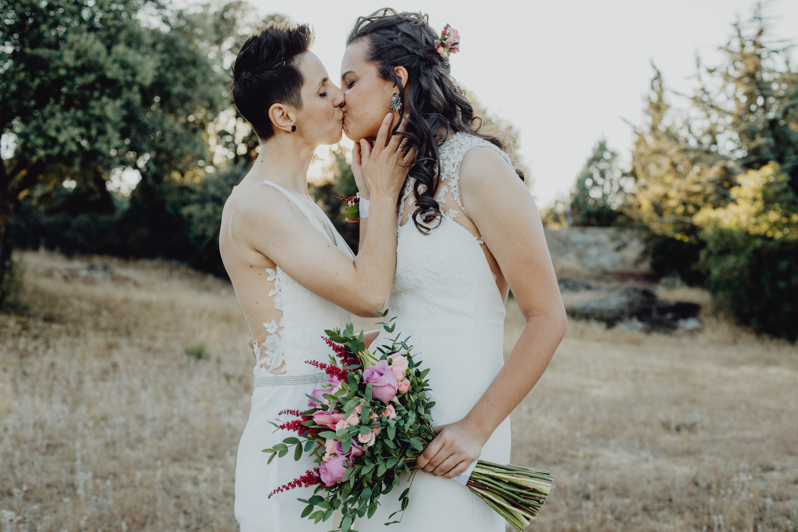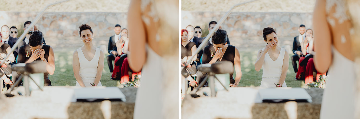 Si quieres ver lo re guapas que iban nuestras novias disfruta de sus fotos de boda. Una boda muy divertida, con música en vivo con sabor de los años ochenta en su fiesta, ritmos africanos en su cocktail y un precioso atardecer lleno de complicidad entre nuestras dos novias.