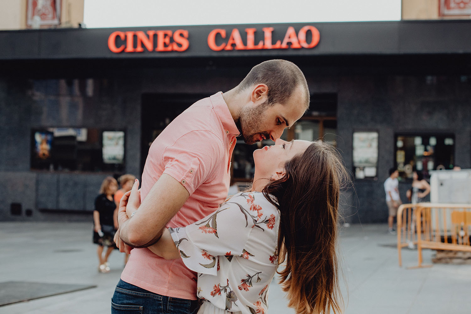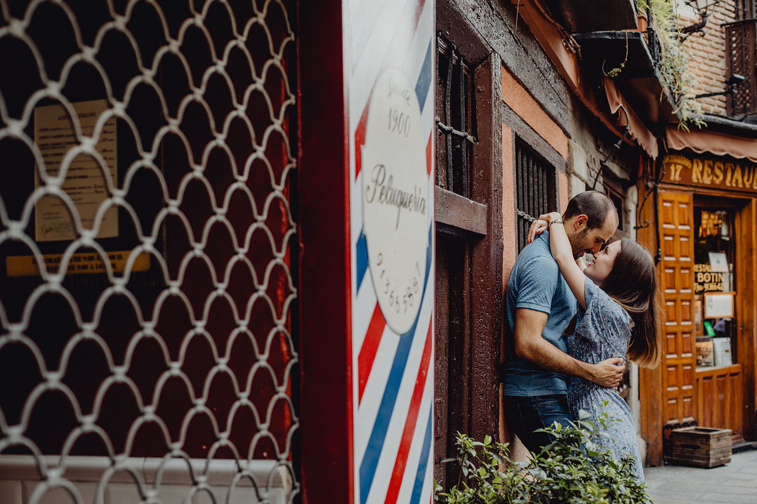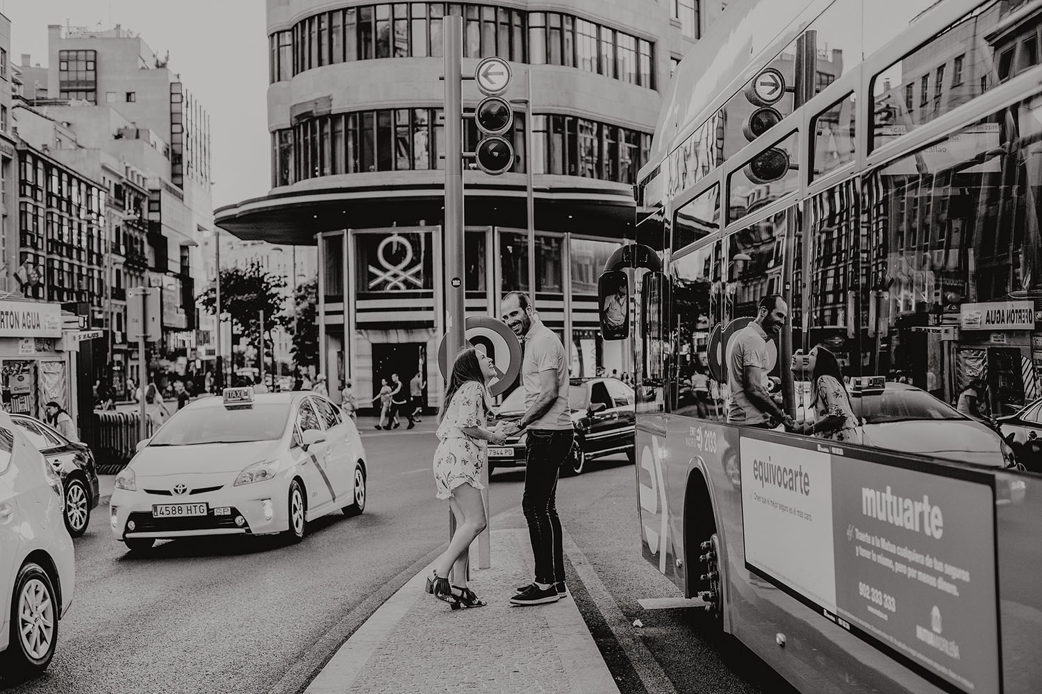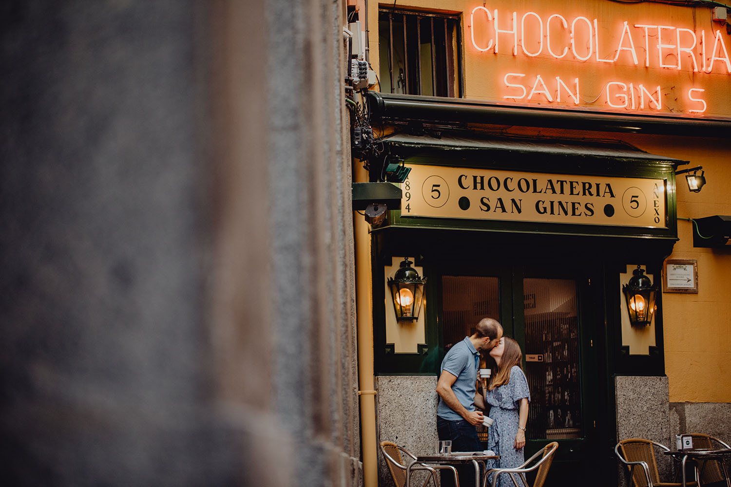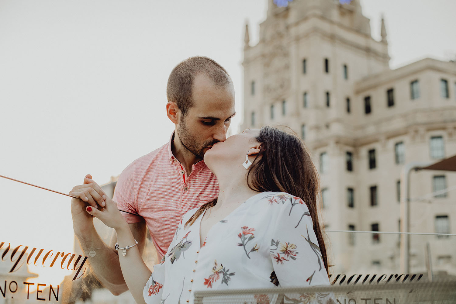 Nos reunimos con ellos en La Escalera de Bailén junto a la Fuente de los Caños Viejos, en La Latina. Y allí empezó la mágia de su preboda bajo el Viaducto de Segovia. Continuamos hasta llegar al 15 de Cuchilleros, un lugar con historia que tras cinco generaciones es la barbería más antigua de Madrid. Los novios nos sorprenderion con un fantásico baile en plena Plaza Mayor. Nos dejaron con la boca abierta a nosotros, y a todos los turistas que pasaban por ahí. Nuestros pasos nos llevaron hasta otra parada mitica, La Chocolatería San Ginés, un clásico. Con el estómago lleno y el corazón caliente, nos vamos a Sol, con parada obligatoria en el kilometro cero, de donde parten todas las seis carreteras nacionales de España. Y por fin, La Torre El Carrion con su super cinematografico cartel luminoso de Schweppes.