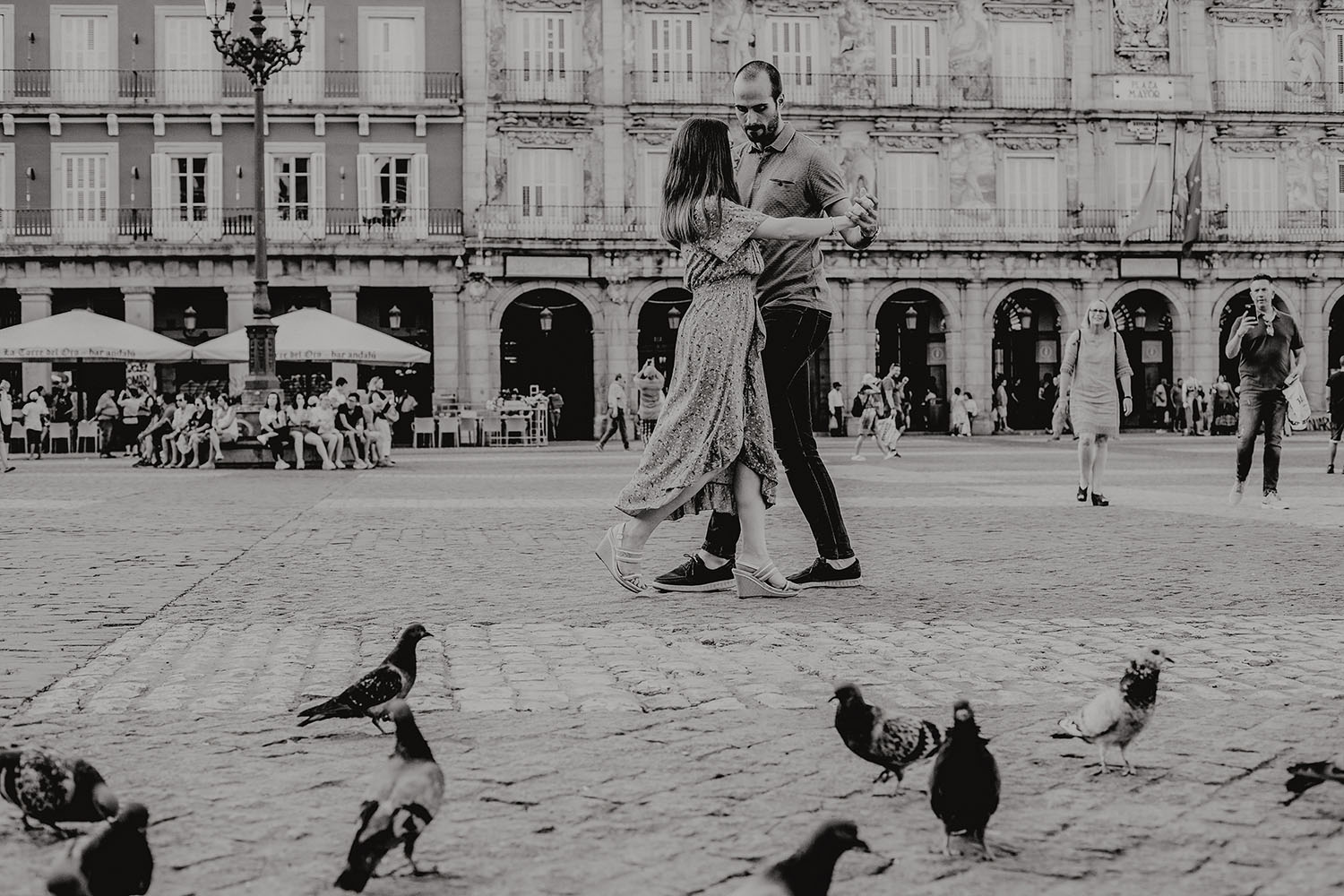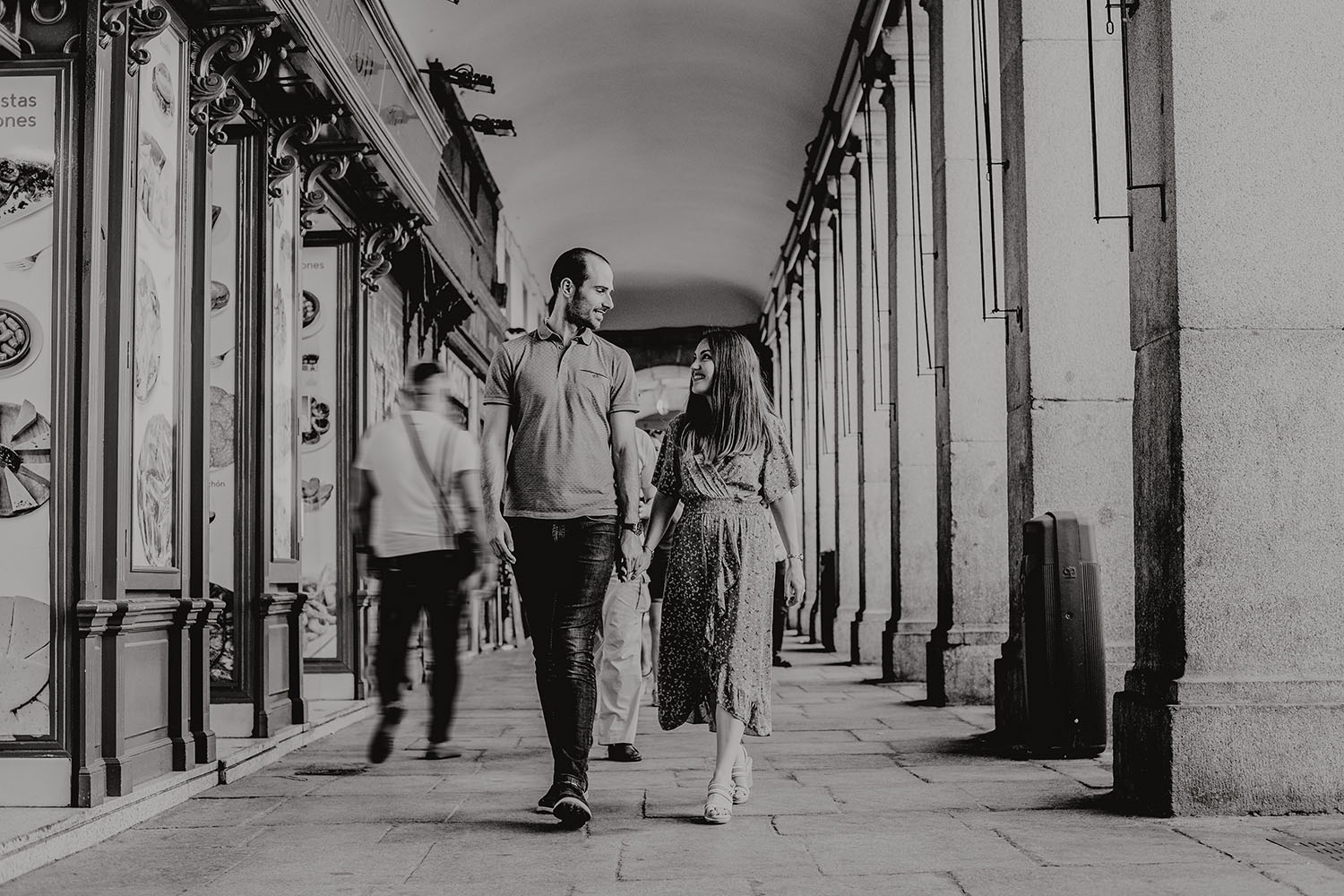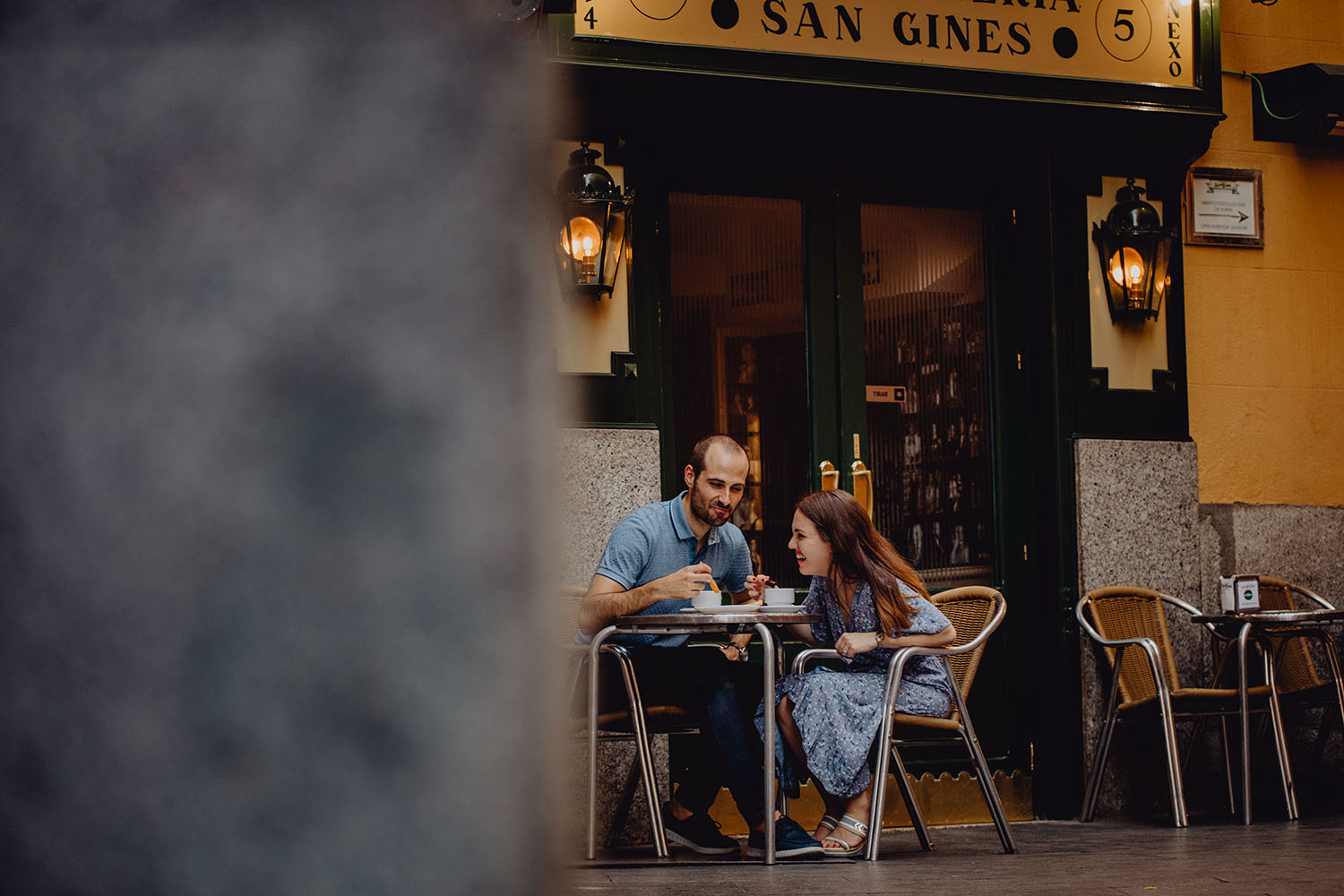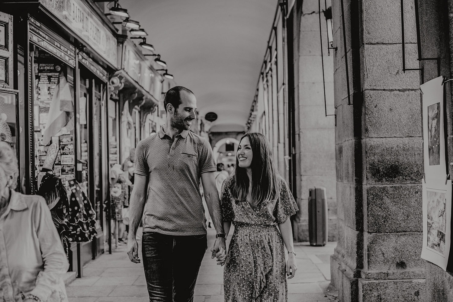 Nos reunimos con ellos en La Escalera de Bailén junto a la Fuente de los Caños Viejos, en La Latina. Y allí empezó la mágia de su preboda bajo el Viaducto de Segovia. Continuamos hasta llegar al 15 de Cuchilleros, un lugar con historia que tras cinco generaciones es la barbería más antigua de Madrid. Los novios nos sorprenderion con un fantásico baile en plena Plaza Mayor. Nos dejaron con la boca abierta a nosotros, y a todos los turistas que pasaban por ahí. Nuestros pasos nos llevaron hasta otra parada mitica, La Chocolatería San Ginés, un clásico. Con el estómago lleno y el corazón caliente, nos vamos a Sol, con parada obligatoria en el kilometro cero, de donde parten todas las seis carreteras nacionales de España. Y por fin, La Torre El Carrion con su super cinematografico cartel luminoso de Schweppes.
