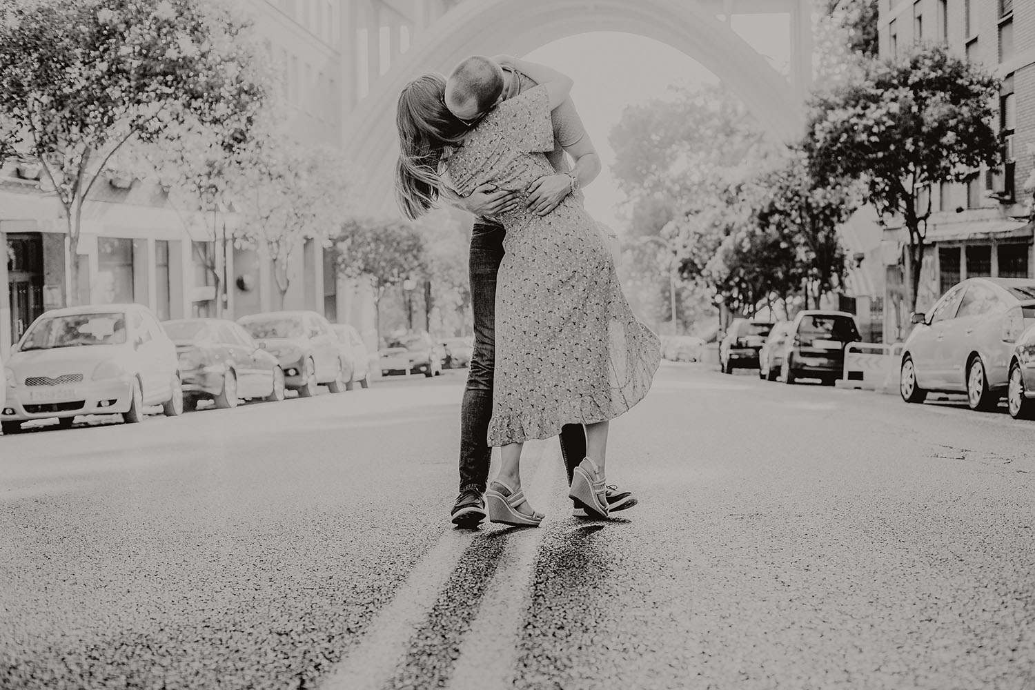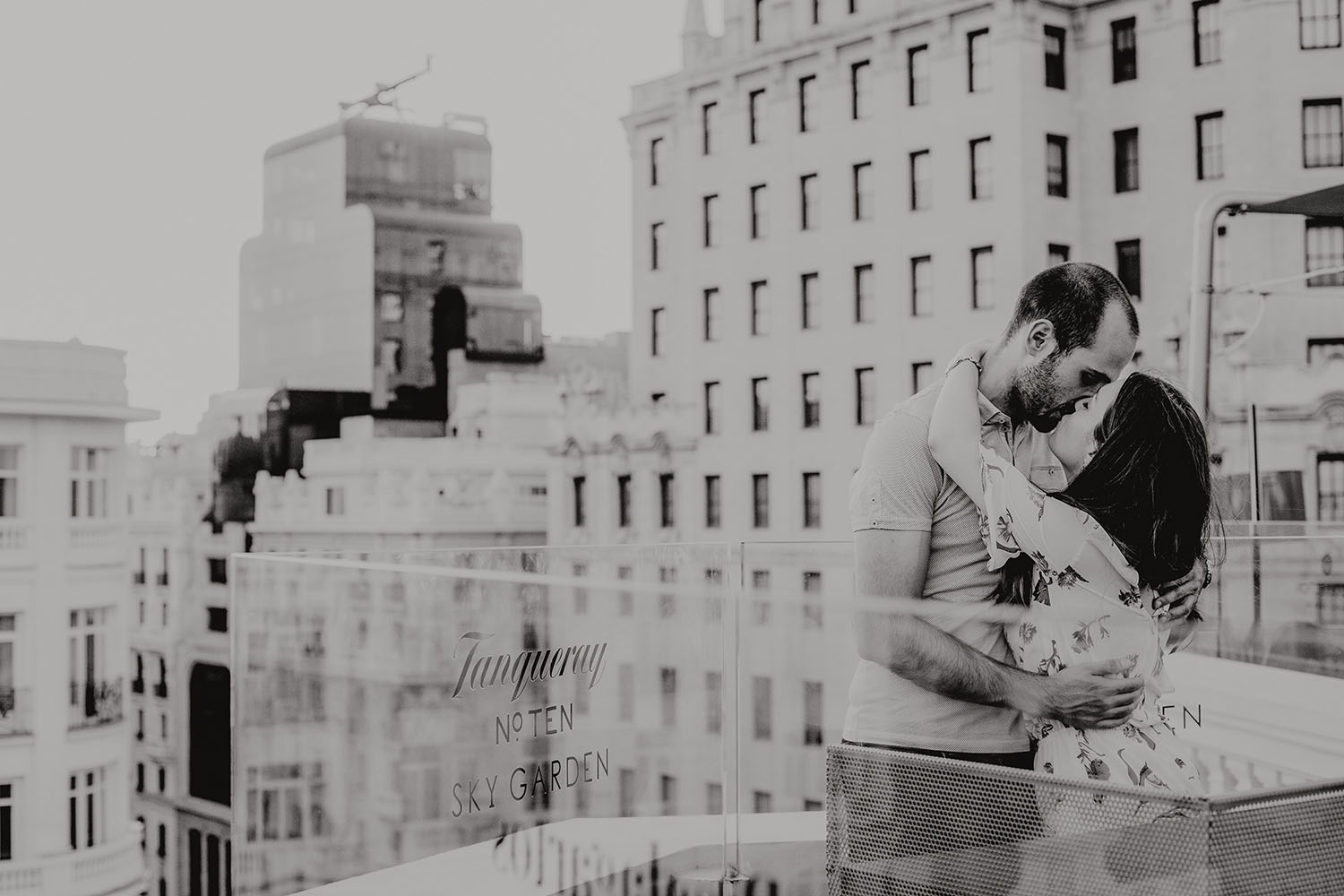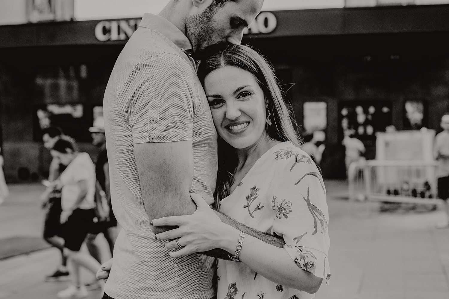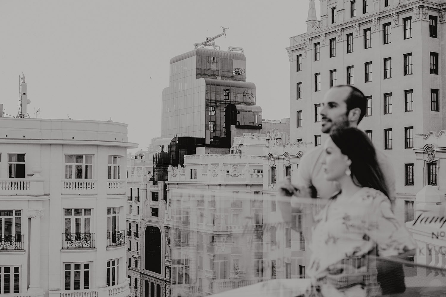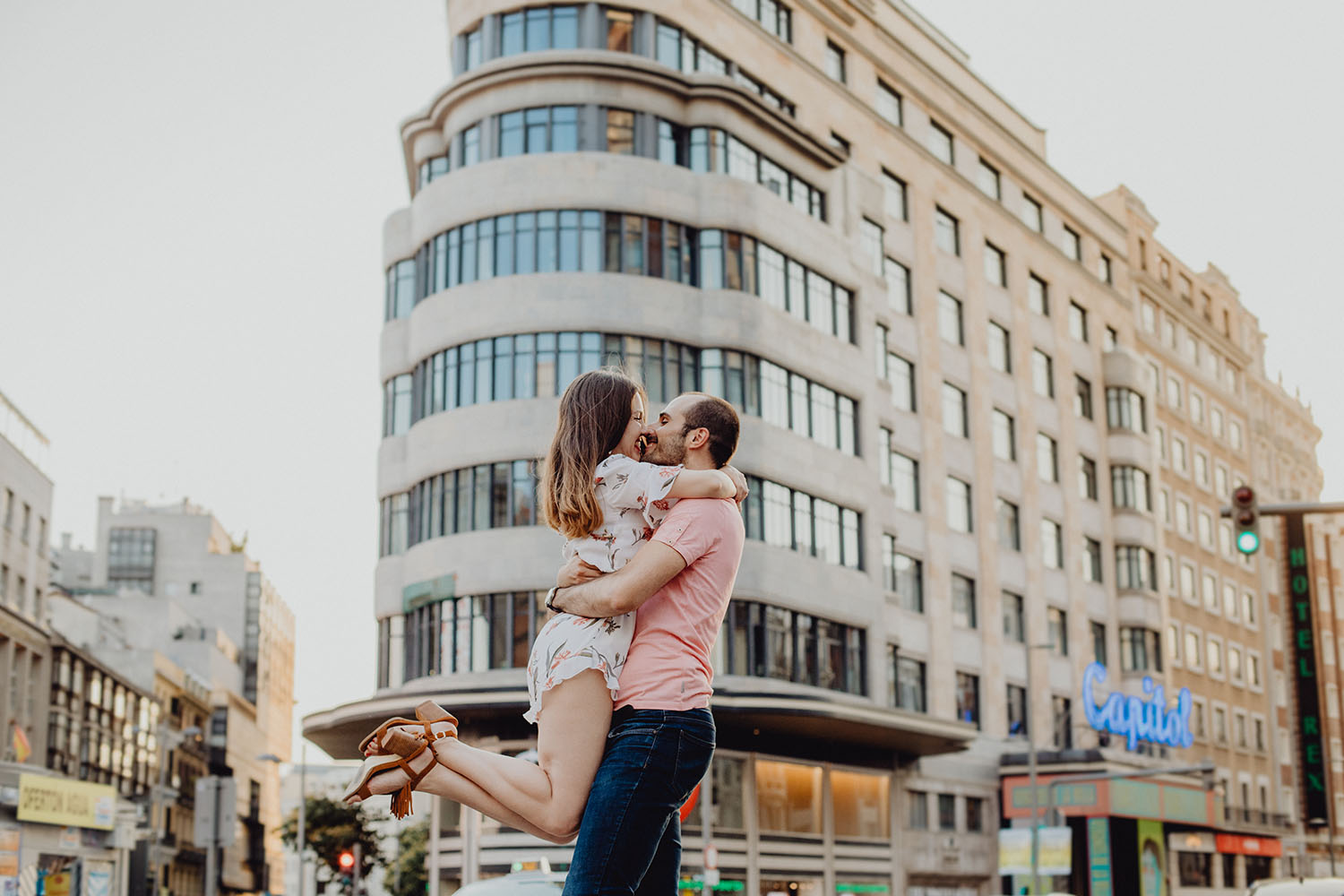 Nos reunimos con ellos en La Escalera de Bailén junto a la Fuente de los Caños Viejos, en La Latina. Y allí empezó la mágia de su preboda bajo el Viaducto de Segovia. Continuamos hasta llegar al 15 de Cuchilleros, un lugar con historia que tras cinco generaciones es la barbería más antigua de Madrid. Los novios nos sorprenderion con un fantásico baile en plena Plaza Mayor. Nos dejaron con la boca abierta a nosotros, y a todos los turistas que pasaban por ahí. Nuestros pasos nos llevaron hasta otra parada mitica, La Chocolatería San Ginés, un clásico. Con el estómago lleno y el corazón caliente, nos vamos a Sol, con parada obligatoria en el kilometro cero, de donde parten todas las seis carreteras nacionales de España. Y por fin, La Torre El Carrion con su super cinematografico cartel luminoso de Schweppes.