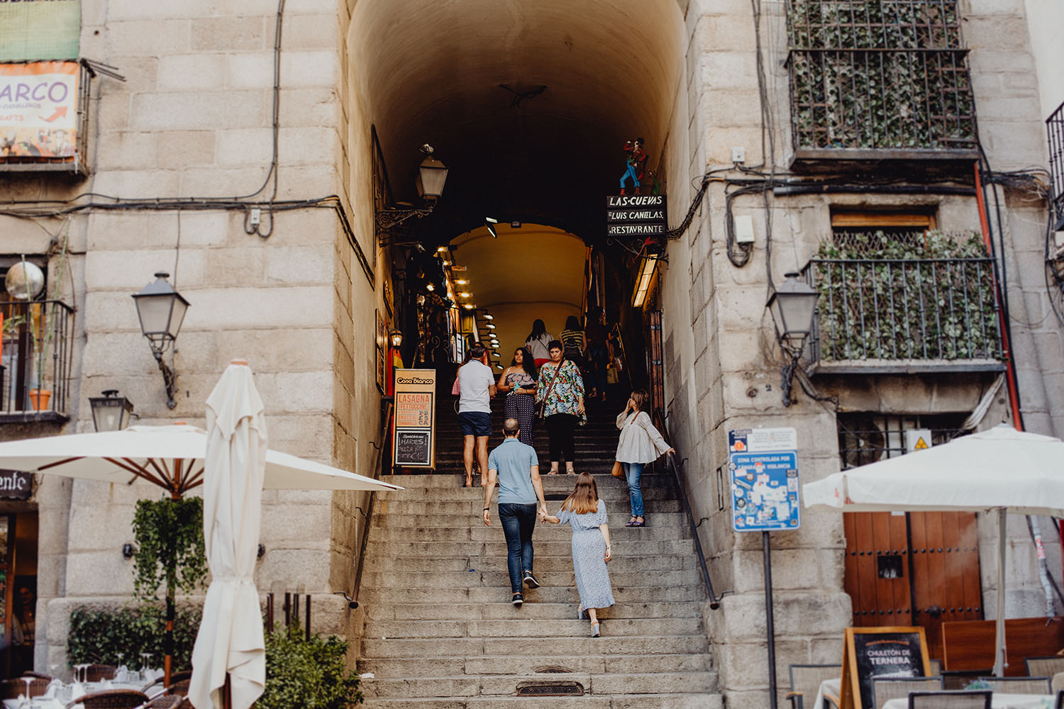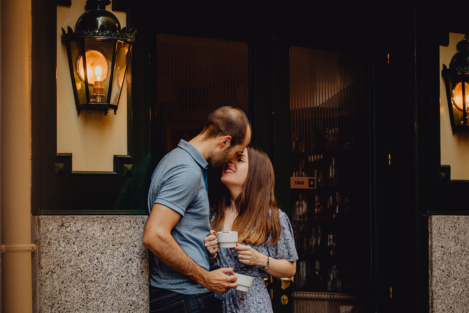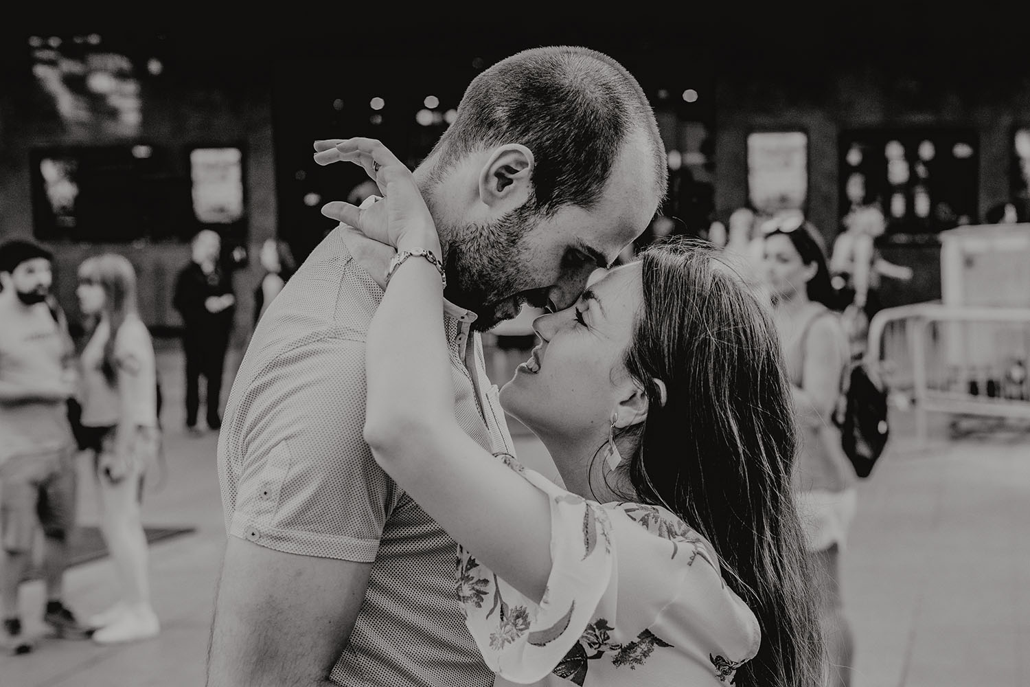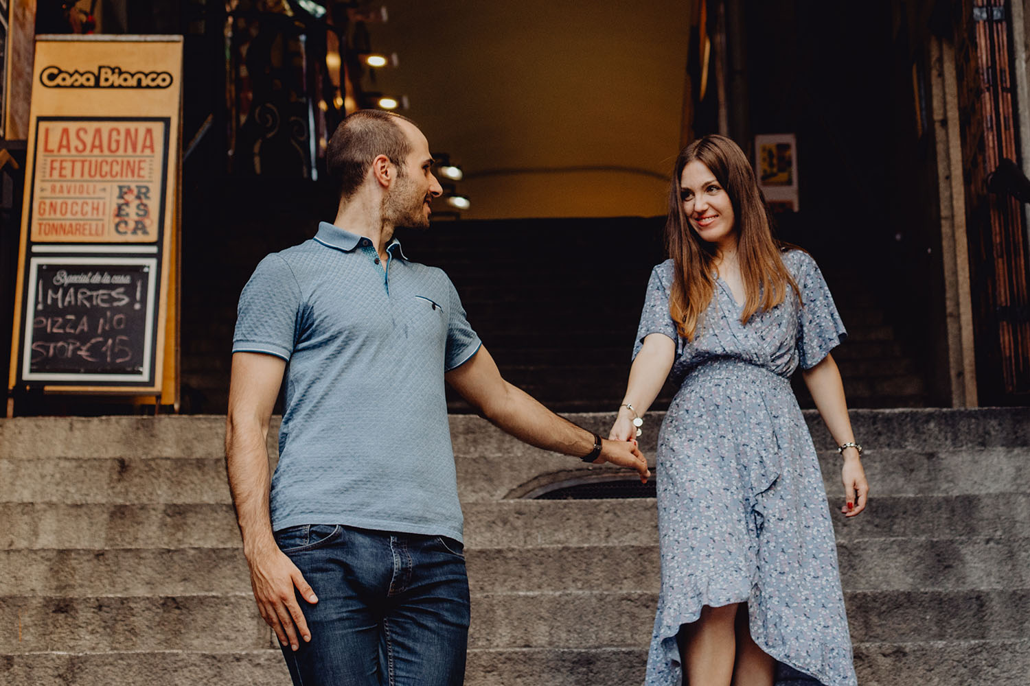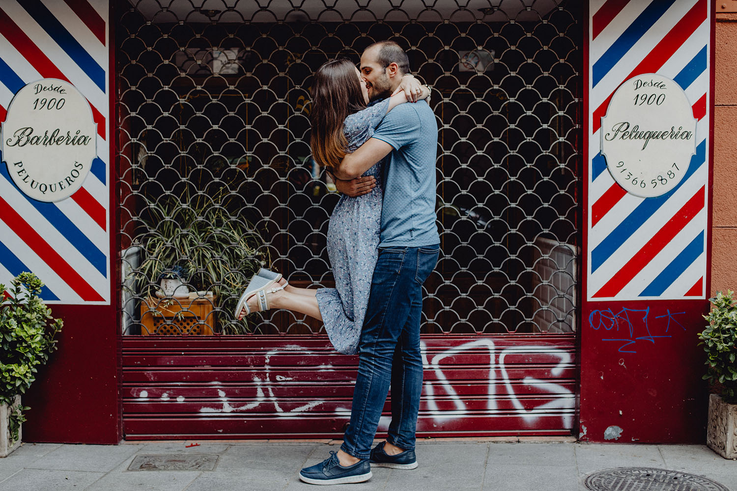 Nos reunimos con ellos en La Escalera de Bailén junto a la Fuente de los Caños Viejos, en La Latina. Y allí empezó la mágia de su preboda bajo el Viaducto de Segovia. Continuamos hasta llegar al 15 de Cuchilleros, un lugar con historia que tras cinco generaciones es la barbería más antigua de Madrid. Los novios nos sorprenderion con un fantásico baile en plena Plaza Mayor. Nos dejaron con la boca abierta a nosotros, y a todos los turistas que pasaban por ahí. Nuestros pasos nos llevaron hasta otra parada mitica, La Chocolatería San Ginés, un clásico. Con el estómago lleno y el corazón caliente, nos vamos a Sol, con parada obligatoria en el kilometro cero, de donde parten todas las seis carreteras nacionales de España. Y por fin, La Torre El Carrion con su super cinematografico cartel luminoso de Schweppes.