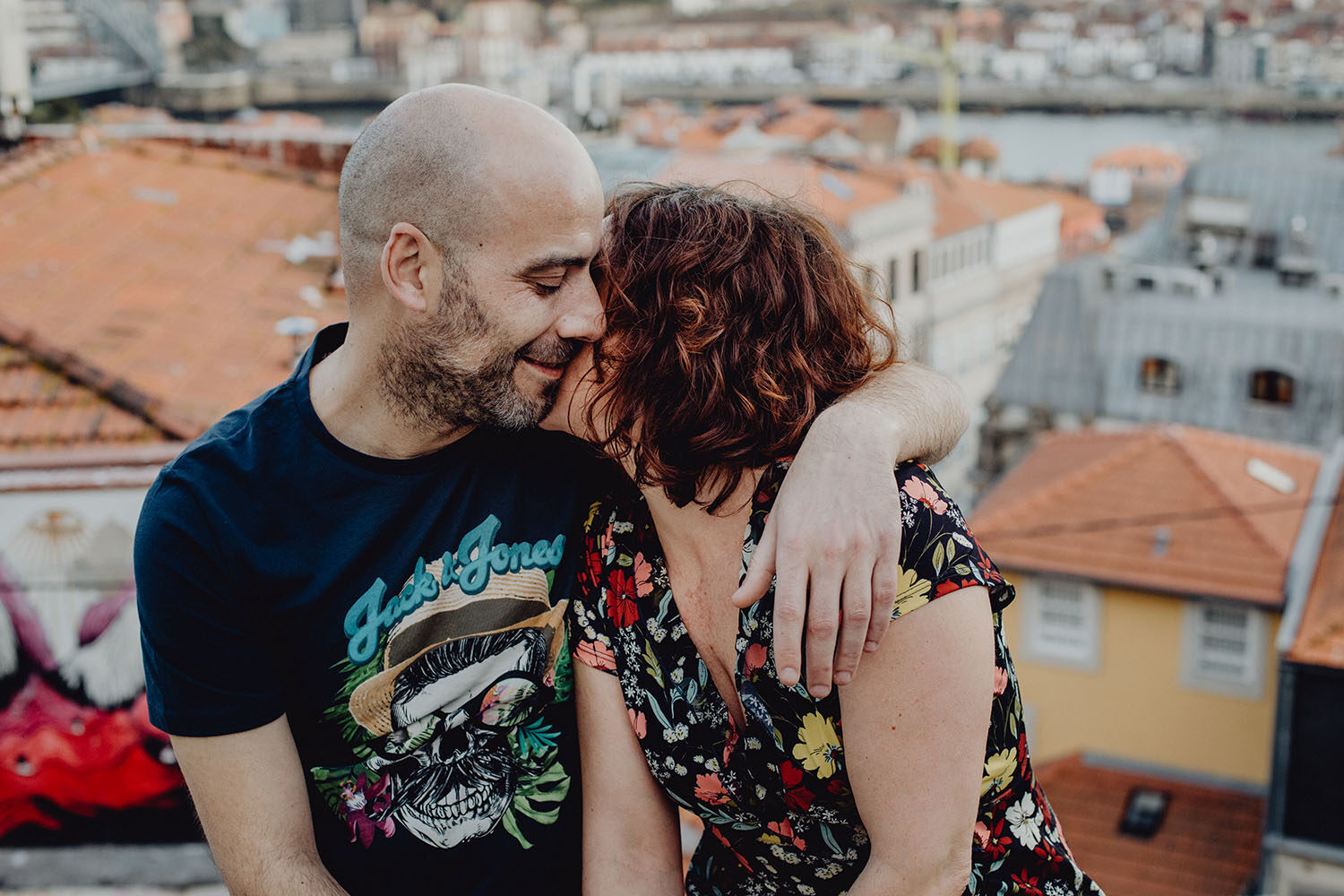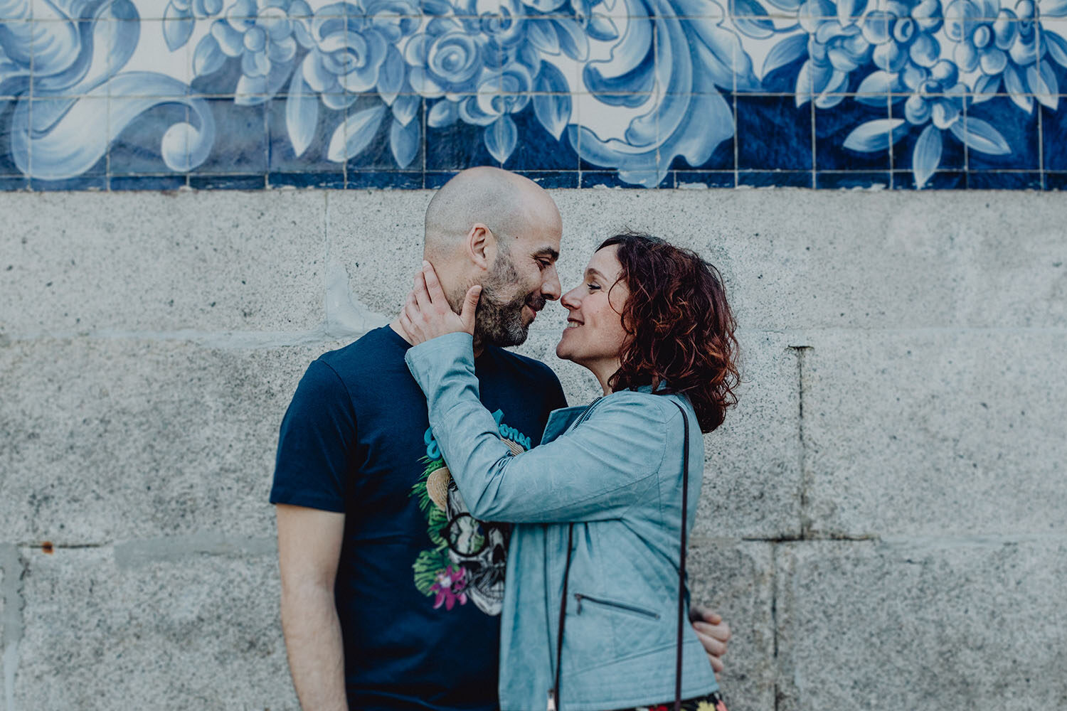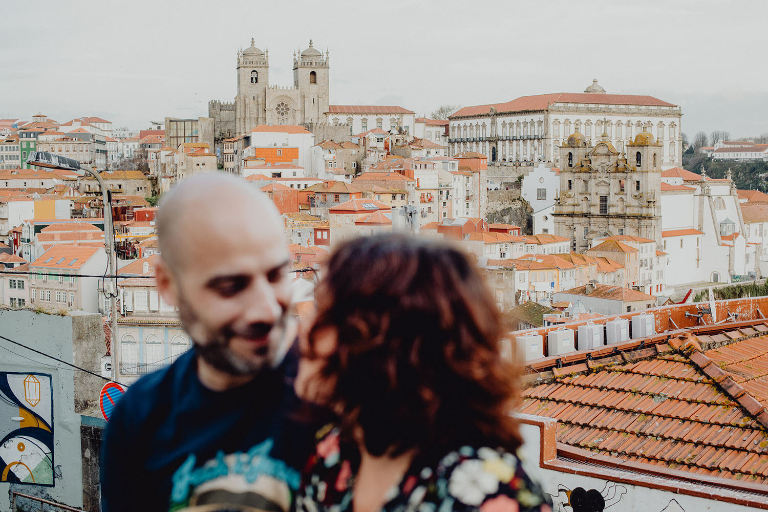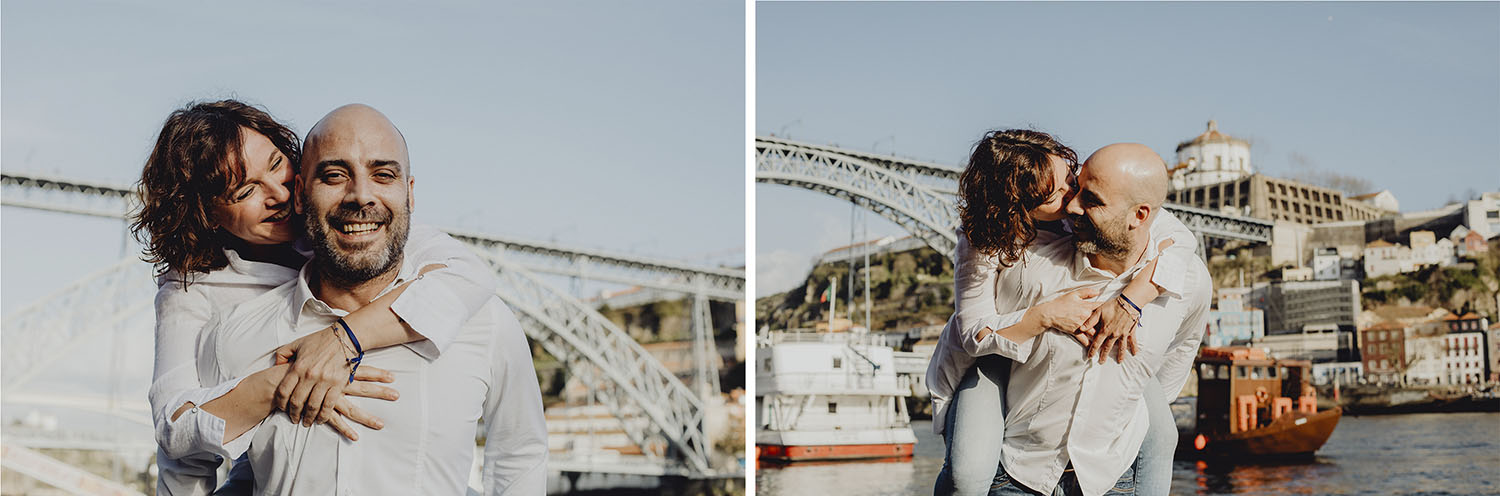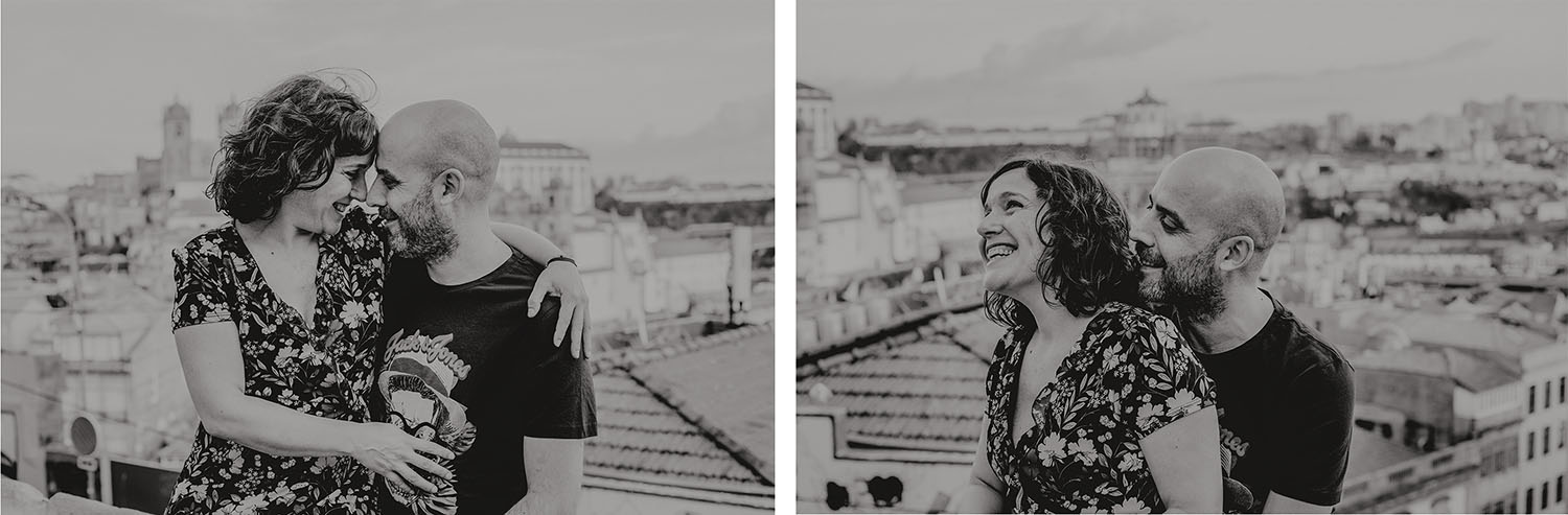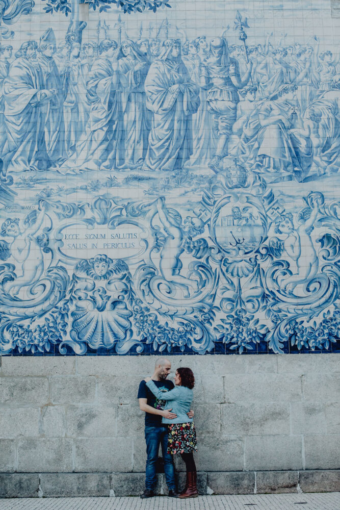 Por el momento, no tienen planes de boda, cuando se enteraron por las redes sociales que Fotógrafo Artístico iba a estar en Portugal haciendo el preboda a otra pareja, no dudaron en contactar con nosotros y contratar el reportaje de pareja urban. Les apetecía mucho tener un reportaje de fotos en Oporto, la ciudad que tan feliz les hace. Para nosotros fue una suerte poder conocer la ciudad de su mano. Su reportaje de fotos comenzó en la Estación de Sao Bento, y podemos decir que es una de las estaciones más hermosas que hayamos conocido. Continuamos caminando a la Catedral Sé do Oporto, hasta que nuestros pasos nos llevaron por sus callejuelas, tejados en los que crece la hierba, la ropa tendida en los balcones, las plantas en las puertas, sin duda es una ciudad de contrastes. Te sorprende con sus pintadas, graffitis y como no, por sus preciosos azulejos que no te dejaran indiferentes en fachadas como la de la Capilla de las Almas. Pasear por la Ribeira, llena de vida, de música, de su gente, sus gaviotas…y disfrutar de las vistas de la ciudad desde los diferentes miradores. Ver a Salu y Mauricio, comerse a besos y reirse juntos con esa complicidad, es enarmorarse un poquito también de ellos y por supuesto enamorarse de Oporto hasta las trancas!