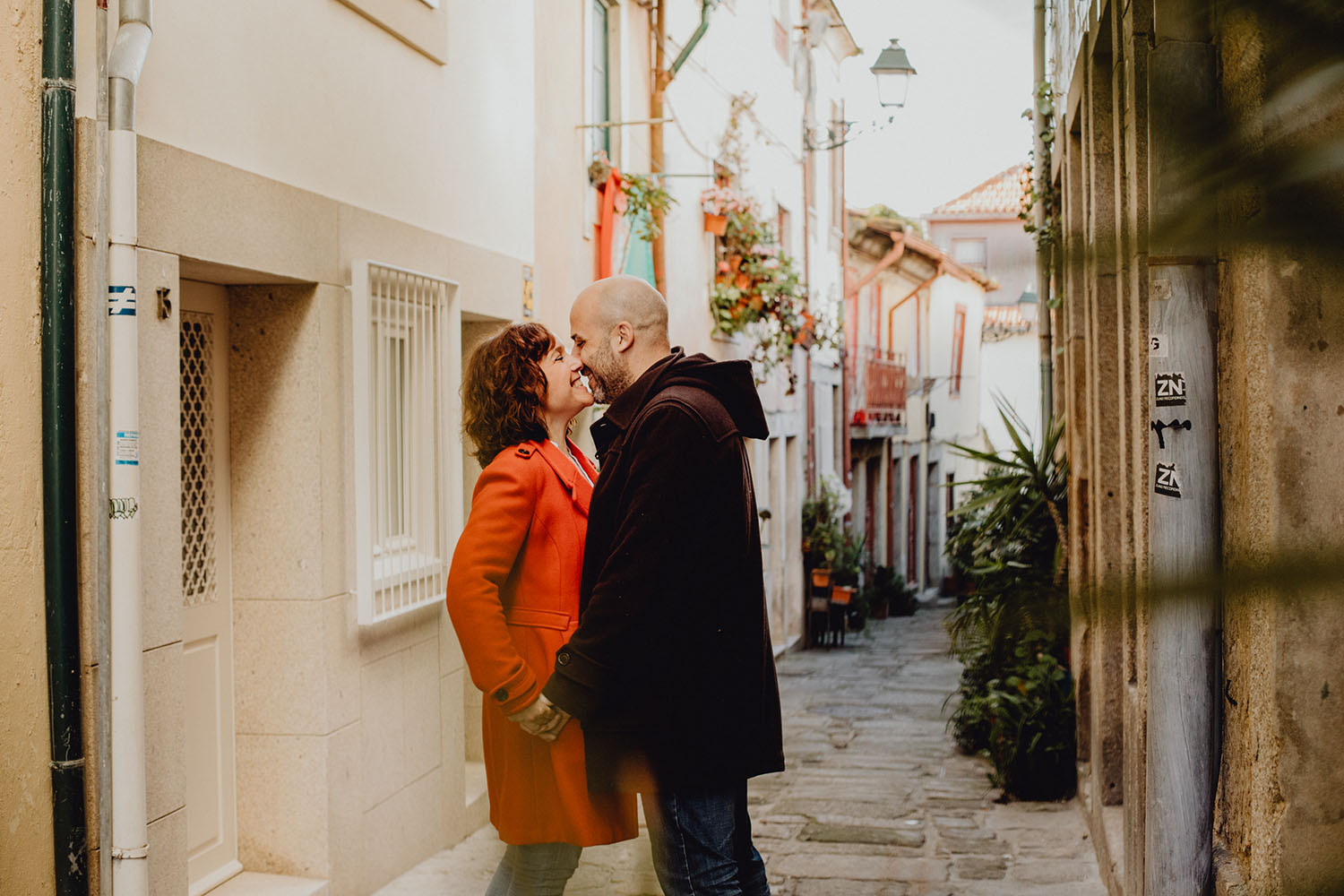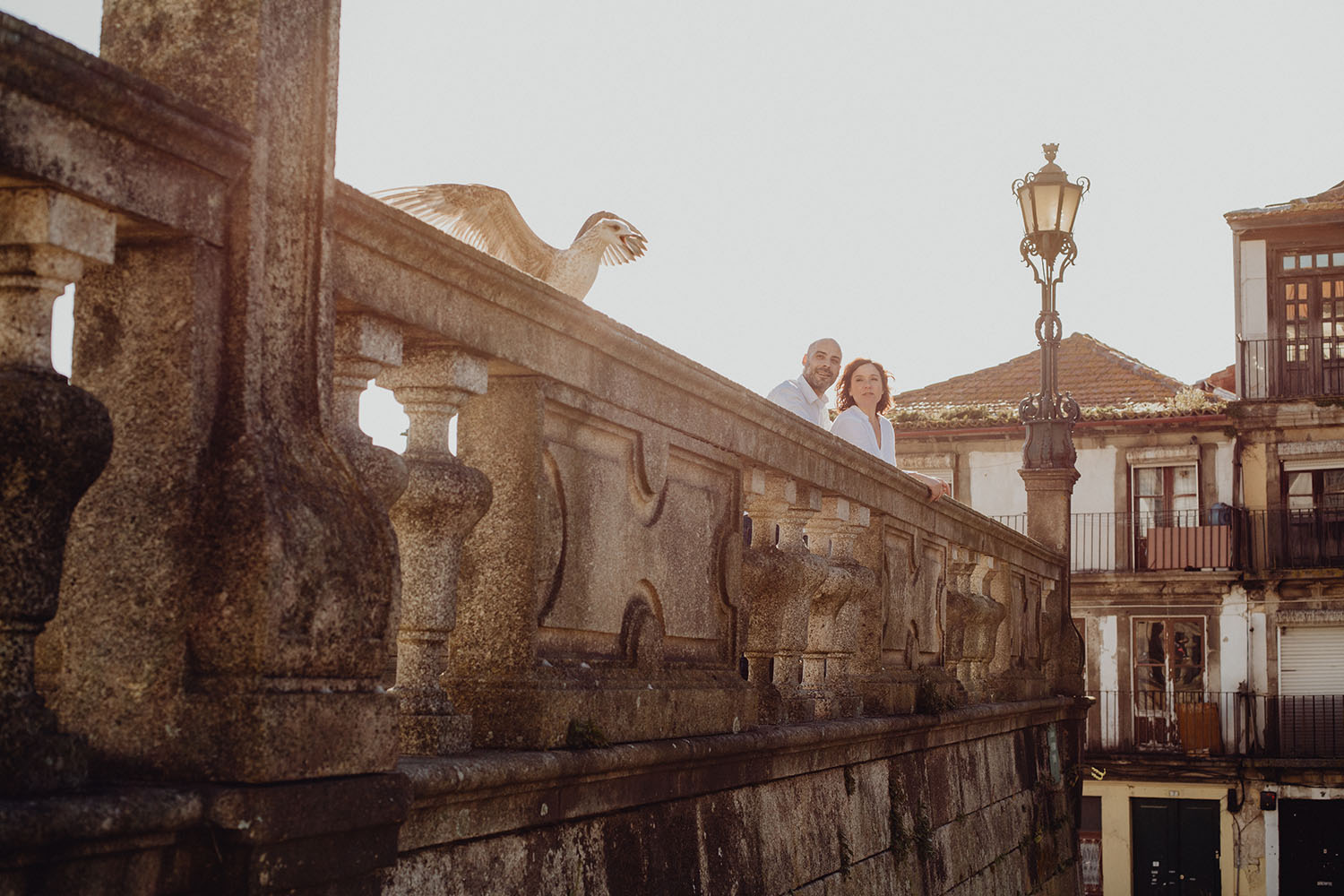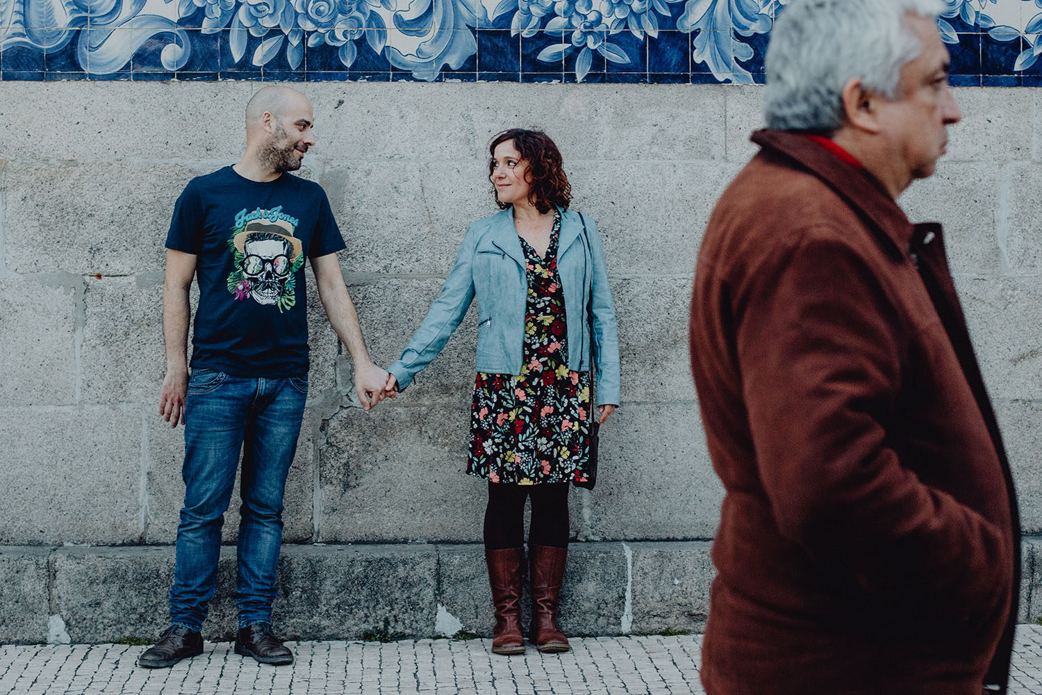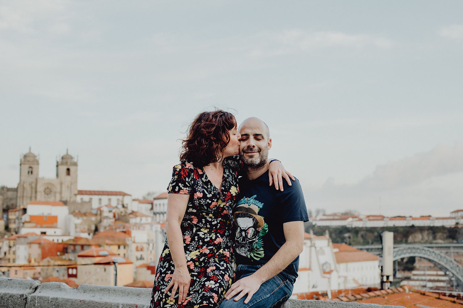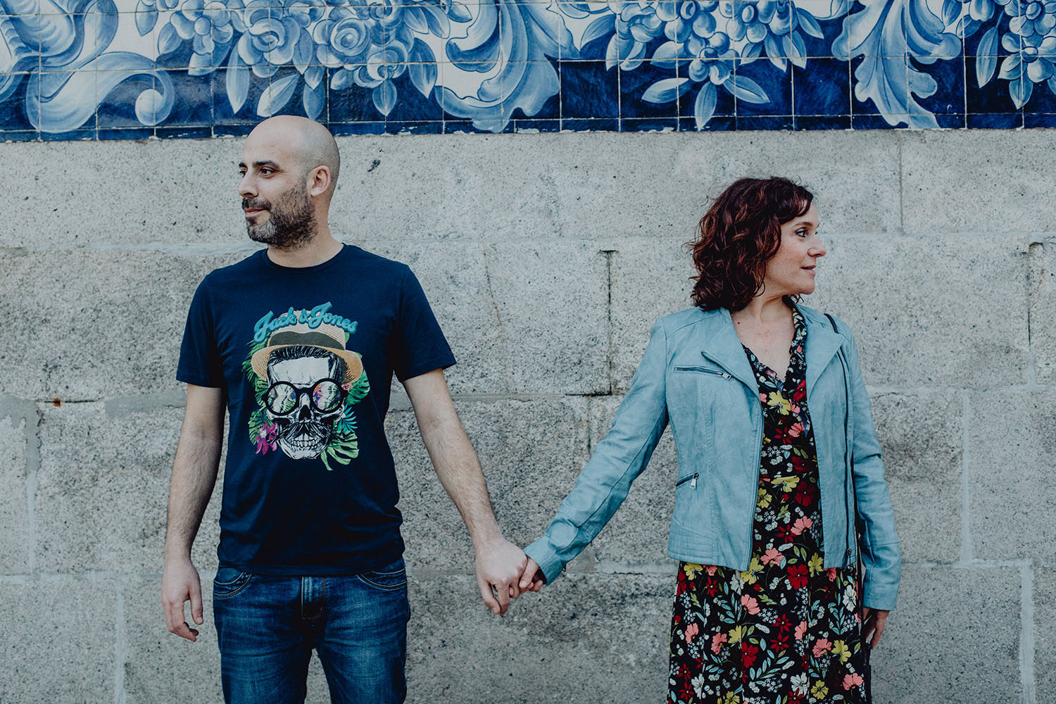 Por el momento, no tienen planes de boda, cuando se enteraron por las redes sociales que Fotógrafo Artístico iba a estar en Portugal haciendo el preboda a otra pareja, no dudaron en contactar con nosotros y contratar el reportaje de pareja urban. Les apetecía mucho tener un reportaje de fotos en Oporto, la ciudad que tan feliz les hace. Para nosotros fue una suerte poder conocer la ciudad de su mano. Su reportaje de fotos comenzó en la Estación de Sao Bento, y podemos decir que es una de las estaciones más hermosas que hayamos conocido. Continuamos caminando a la Catedral Sé do Oporto, hasta que nuestros pasos nos llevaron por sus callejuelas, tejados en los que crece la hierba, la ropa tendida en los balcones, las plantas en las puertas, sin duda es una ciudad de contrastes. Te sorprende con sus pintadas, graffitis y como no, por sus preciosos azulejos que no te dejaran indiferentes en fachadas como la de la Capilla de las Almas. Pasear por la Ribeira, llena de vida, de música, de su gente, sus gaviotas…y disfrutar de las vistas de la ciudad desde los diferentes miradores. Ver a Salu y Mauricio, comerse a besos y reirse juntos con esa complicidad, es enarmorarse un poquito también de ellos y por supuesto enamorarse de Oporto hasta las trancas!