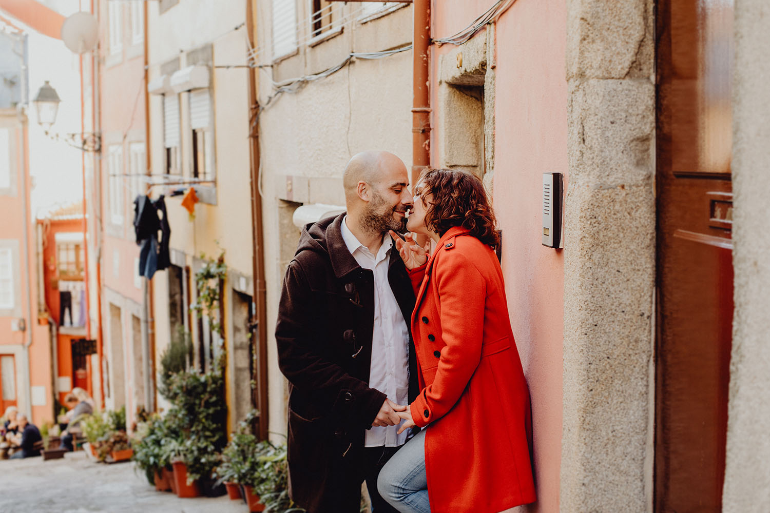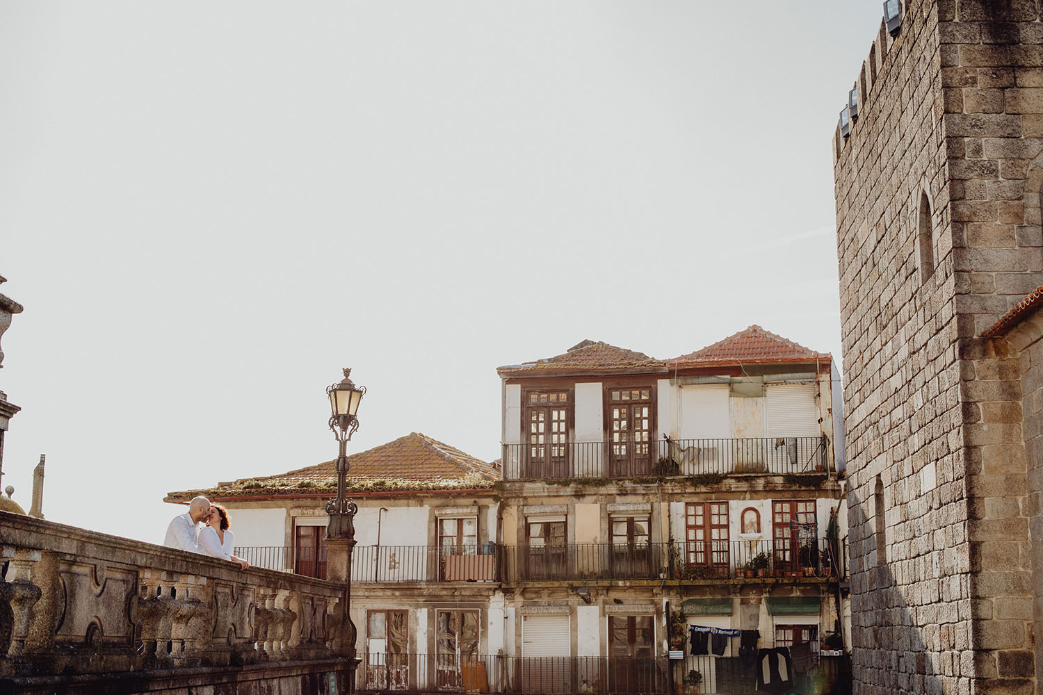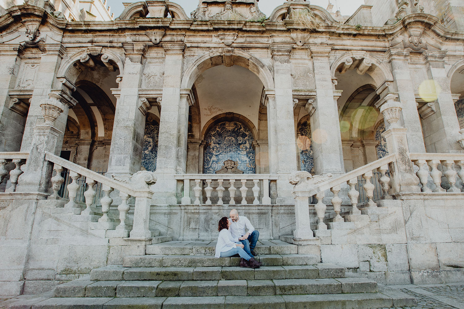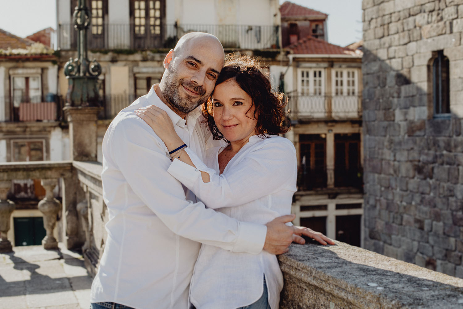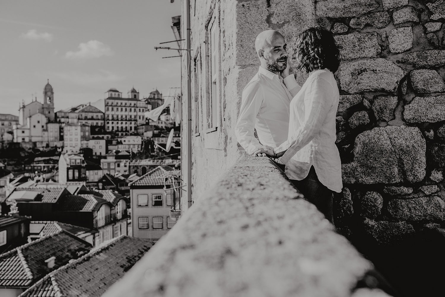 Por el momento, no tienen planes de boda, cuando se enteraron por las redes sociales que Fotógrafo Artístico iba a estar en Portugal haciendo el preboda a otra pareja, no dudaron en contactar con nosotros y contratar el reportaje de pareja urban. Les apetecía mucho tener un reportaje de fotos en Oporto, la ciudad que tan feliz les hace. Para nosotros fue una suerte poder conocer la ciudad de su mano. Su reportaje de fotos comenzó en la Estación de Sao Bento, y podemos decir que es una de las estaciones más hermosas que hayamos conocido. Continuamos caminando a la Catedral Sé do Oporto, hasta que nuestros pasos nos llevaron por sus callejuelas, tejados en los que crece la hierba, la ropa tendida en los balcones, las plantas en las puertas, sin duda es una ciudad de contrastes. Te sorprende con sus pintadas, graffitis y como no, por sus preciosos azulejos que no te dejaran indiferentes en fachadas como la de la Capilla de las Almas. Pasear por la Ribeira, llena de vida, de música, de su gente, sus gaviotas…y disfrutar de las vistas de la ciudad desde los diferentes miradores. Ver a Salu y Mauricio, comerse a besos y reirse juntos con esa complicidad, es enarmorarse un poquito también de ellos y por supuesto enamorarse de Oporto hasta las trancas!
