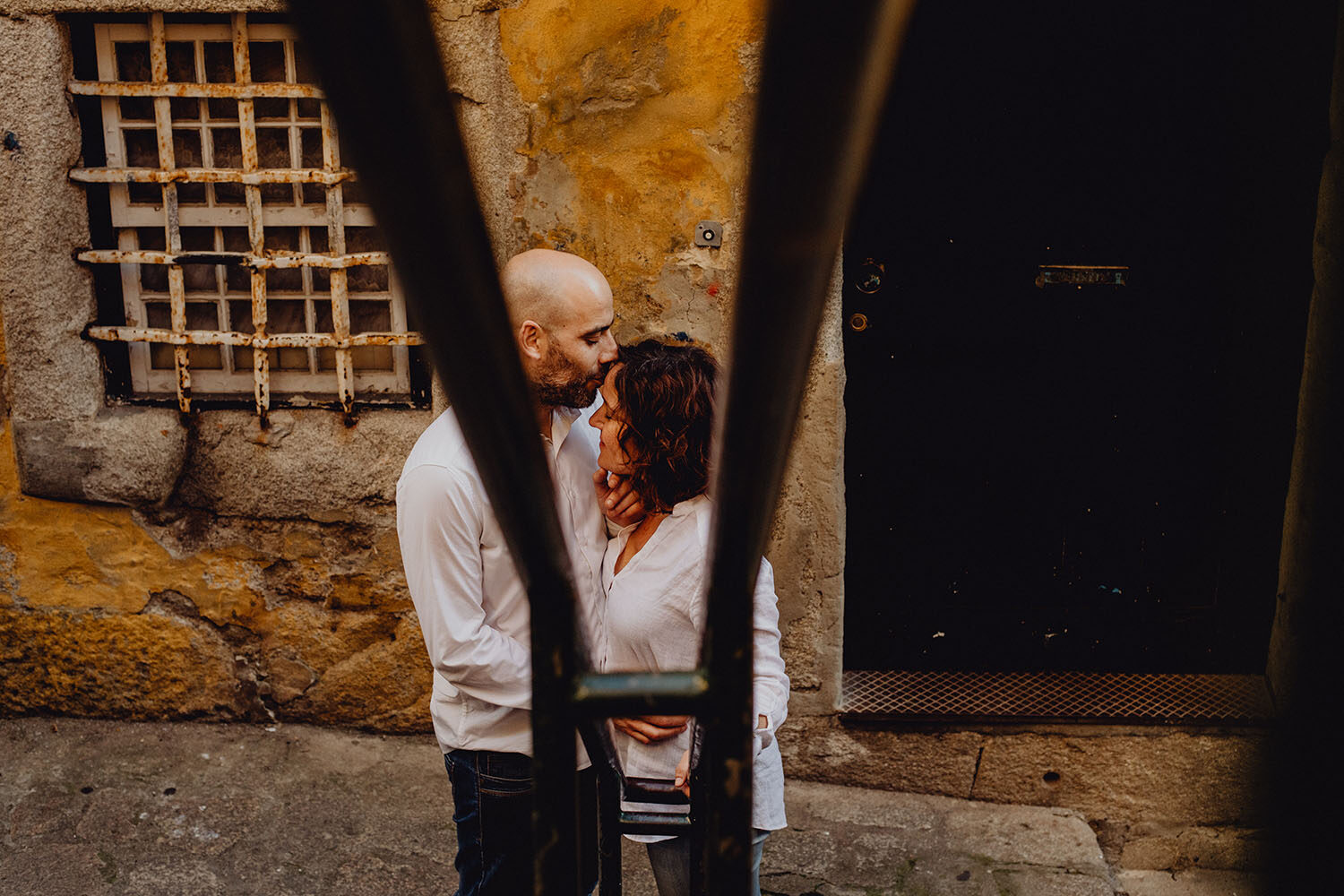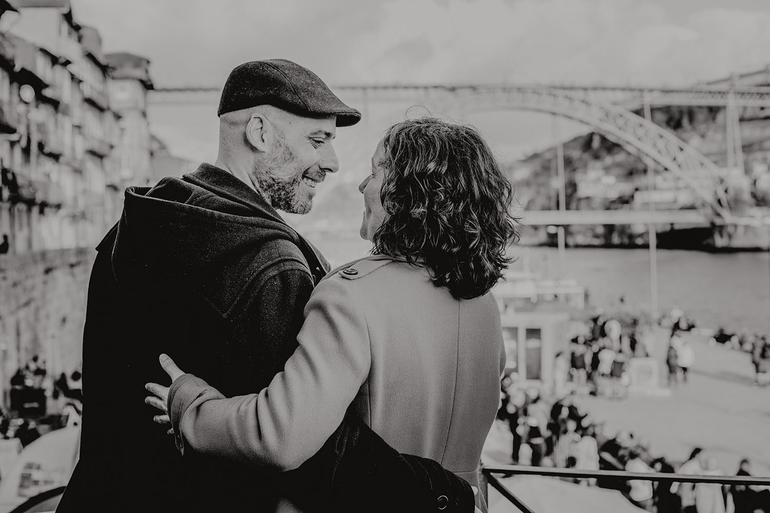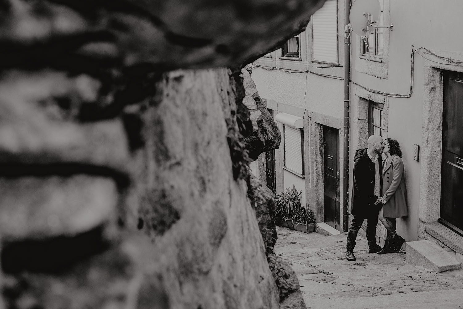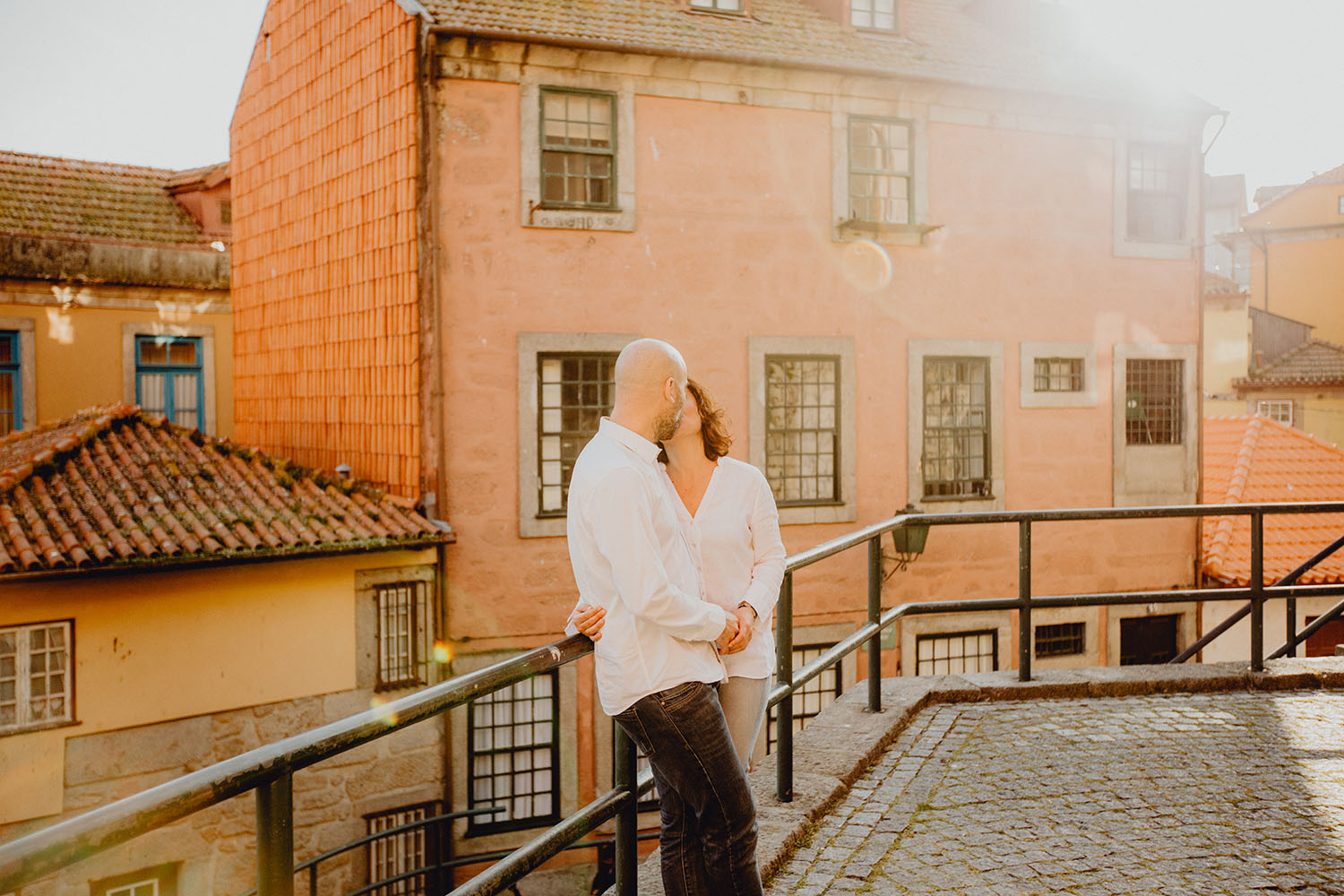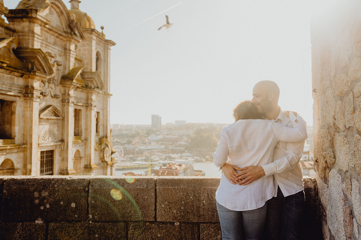 Por el momento, no tienen planes de boda, cuando se enteraron por las redes sociales que Fotógrafo Artístico iba a estar en Portugal haciendo el preboda a otra pareja, no dudaron en contactar con nosotros y contratar el reportaje de pareja urban. Les apetecía mucho tener un reportaje de fotos en Oporto, la ciudad que tan feliz les hace. Para nosotros fue una suerte poder conocer la ciudad de su mano. Su reportaje de fotos comenzó en la Estación de Sao Bento, y podemos decir que es una de las estaciones más hermosas que hayamos conocido. Continuamos caminando a la Catedral Sé do Oporto, hasta que nuestros pasos nos llevaron por sus callejuelas, tejados en los que crece la hierba, la ropa tendida en los balcones, las plantas en las puertas, sin duda es una ciudad de contrastes. Te sorprende con sus pintadas, graffitis y como no, por sus preciosos azulejos que no te dejaran indiferentes en fachadas como la de la Capilla de las Almas. Pasear por la Ribeira, llena de vida, de música, de su gente, sus gaviotas…y disfrutar de las vistas de la ciudad desde los diferentes miradores. Ver a Salu y Mauricio, comerse a besos y reirse juntos con esa complicidad, es enarmorarse un poquito también de ellos y por supuesto enamorarse de Oporto hasta las trancas!