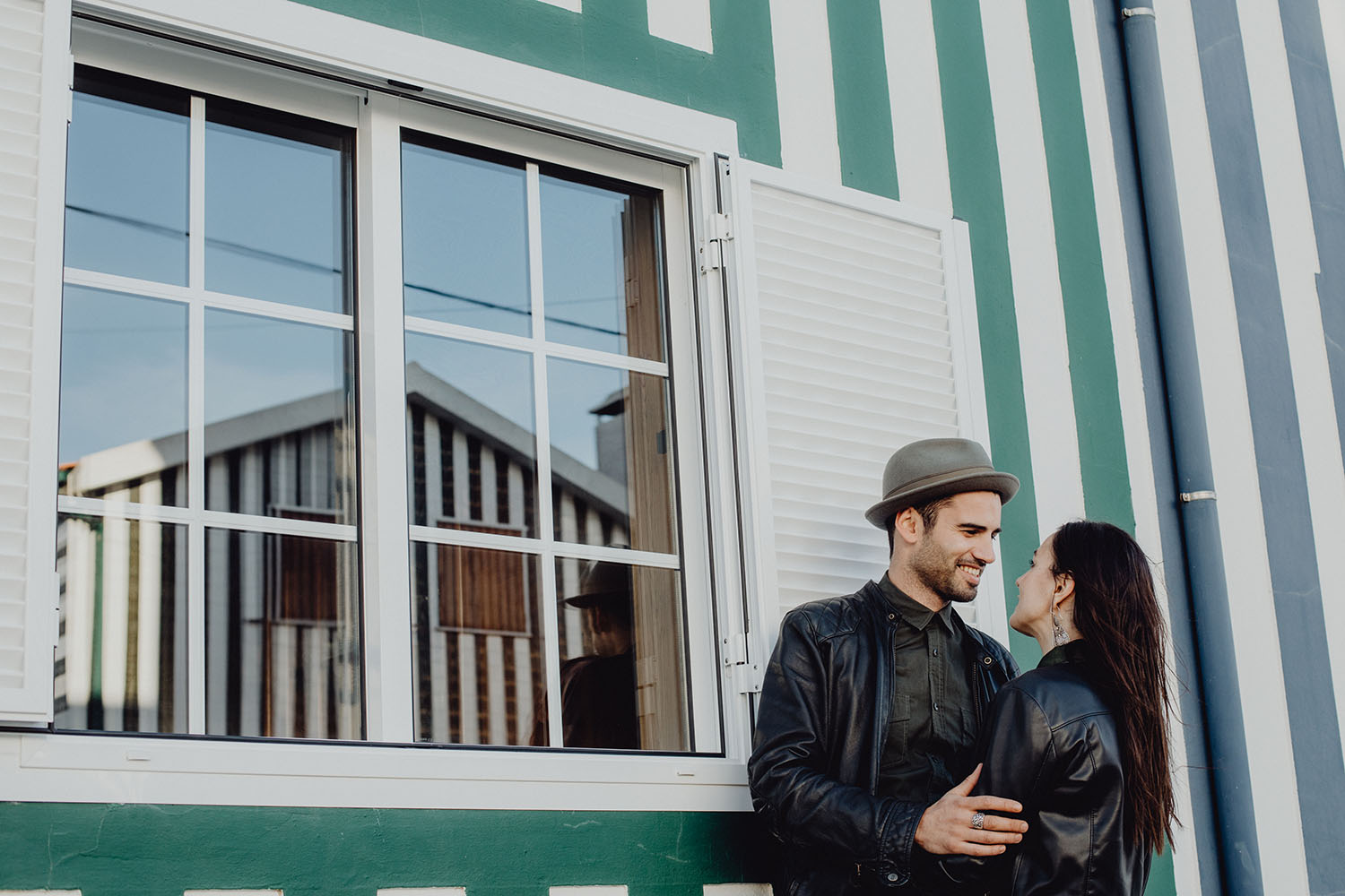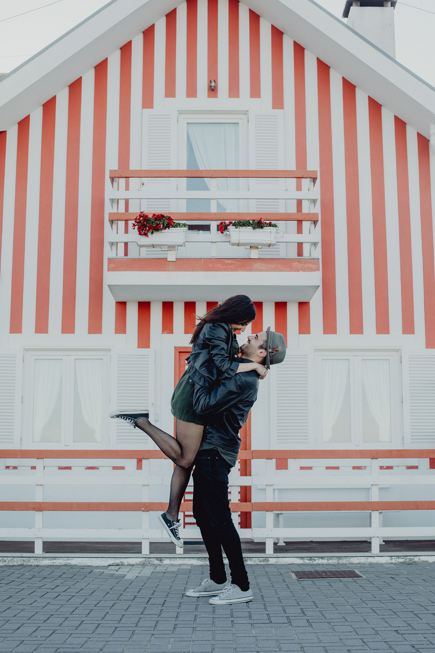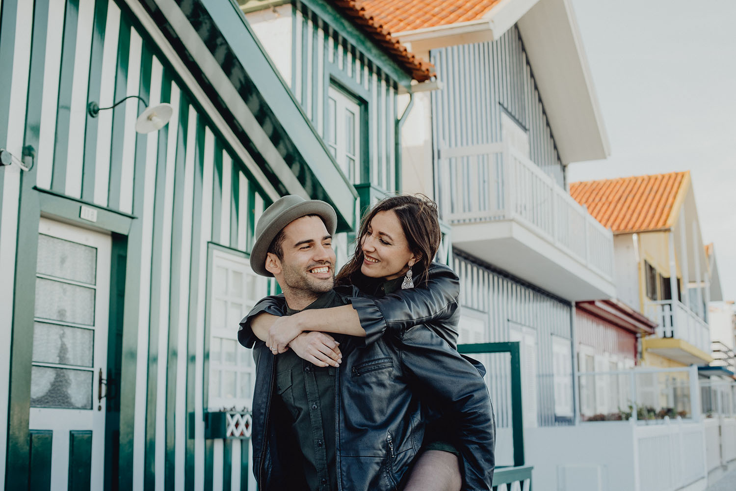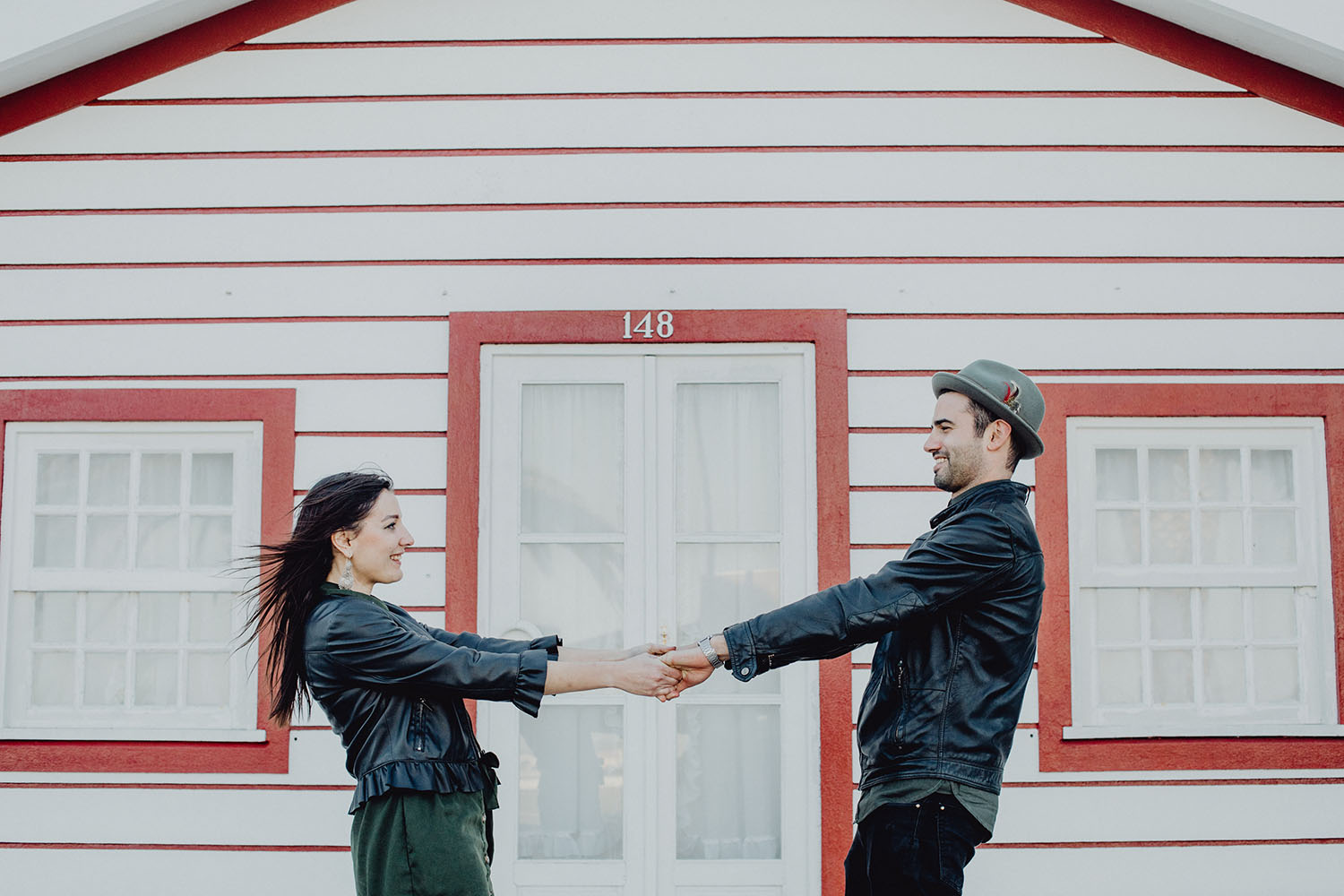 Huyendo del viento, hicimos la última localización del preboda, la habíamos elegido nosotros investigando por internet desde el pisito en Madrid. Pero llegar allí y ver todas esas casitas de cuento, superó nuestros expectativas. Una paleta cromática donde divertirse con saltos y carreras de la pareja, llenos de besos y risas. Así es Costa Nova, la playa más colorida de Portugal. En sus orígenes eran los palheiros las casas tradicionales de los pescadores, ahora la costa se viste de rayas de todos los colores, amarillas, rojas, verdes, azules…una oda al color, y a la estética que tanto nos vuelve locos a los fotógrafos.